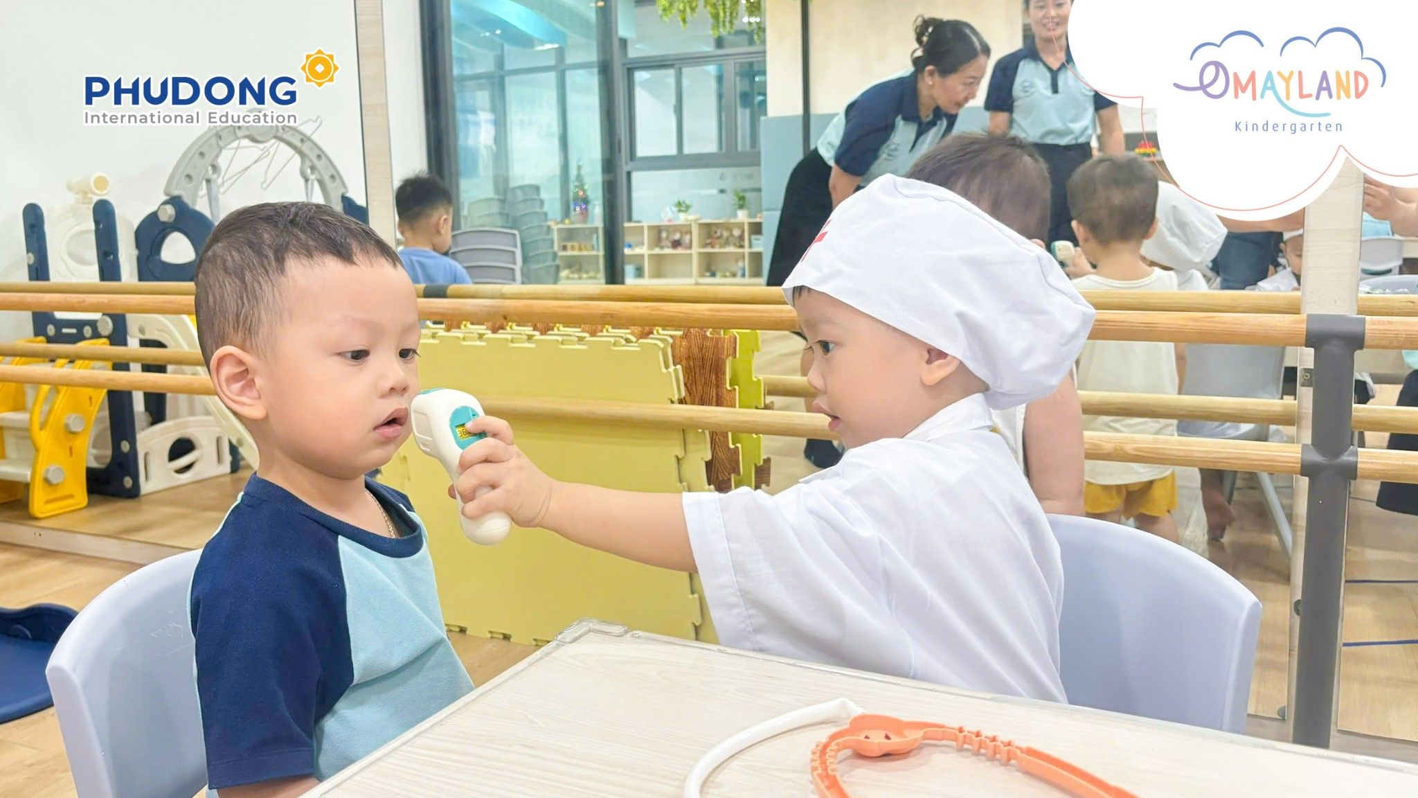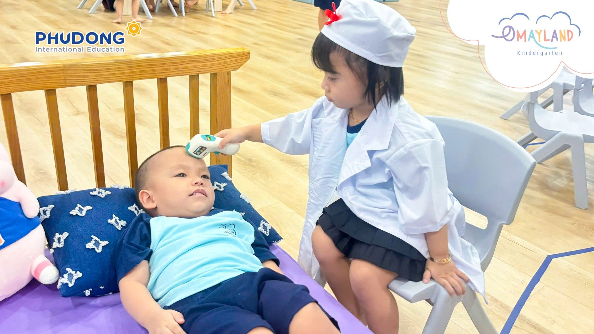 Đáng yêu nhất ở hoạt động trải nghiệm ngày hôm nay chính là khoảnh khắc bé hóa thân thành những “bác sĩ nhí”. Với bộ dụng cụ y tế mini, các bạn nhỏ đã nghe tim, soi họng, dán băng cá nhân cho bạn và thì thầm những câu nói đầy trìu mến: “Bạn đau chỗ nào?”, “Để bác sĩ khám răng cho con nha”...