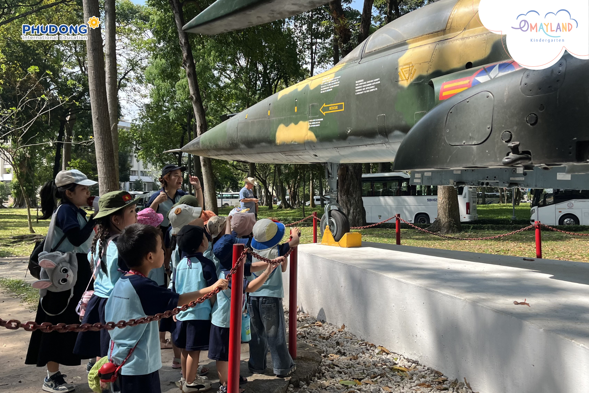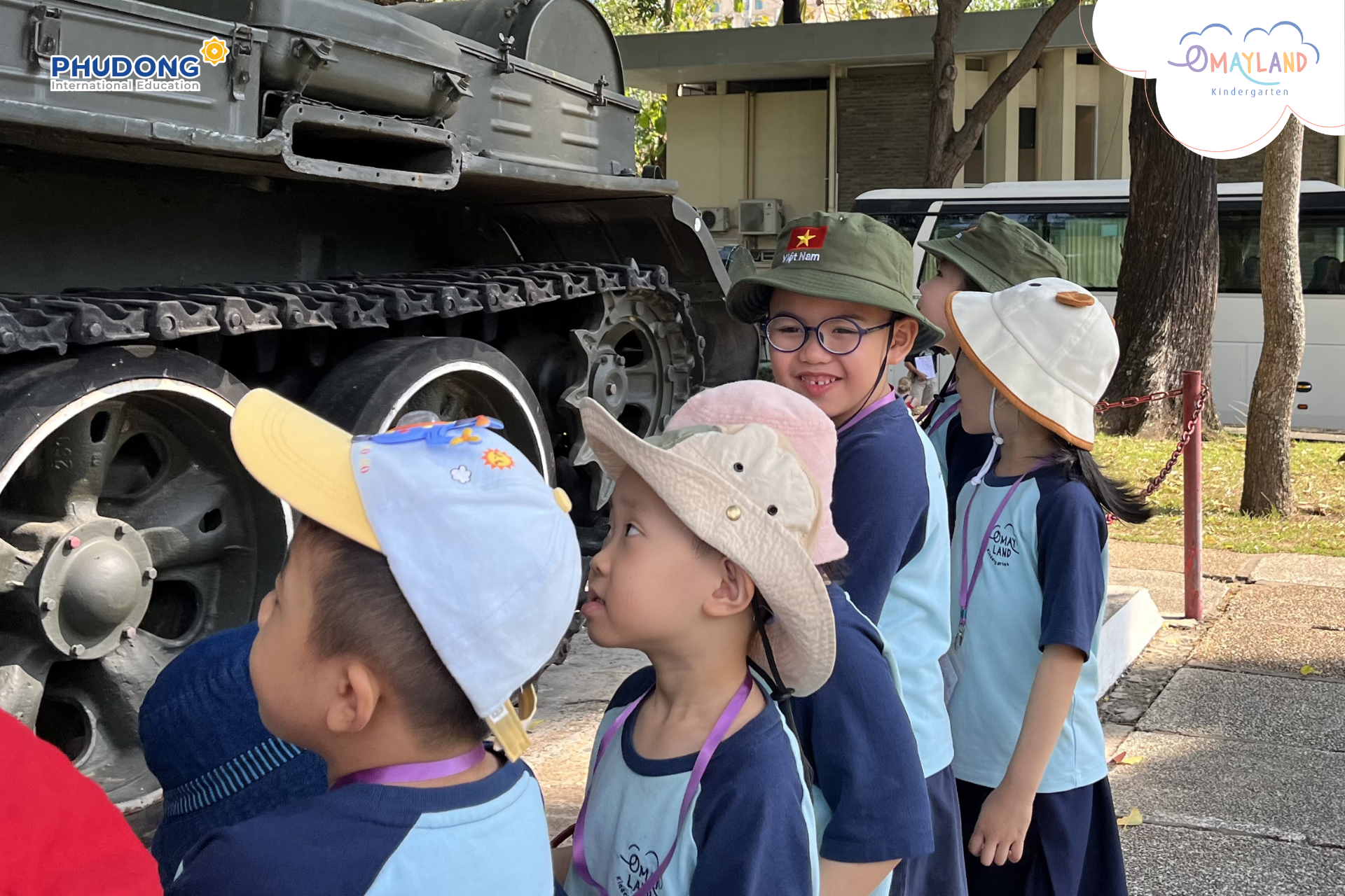 Trong không gian rộng lớn của Dinh Độc Lập, mỗi bước chân của các con đều là một khám phá mới. Các con lắng nghe những câu chuyện lịch sử, quan sát những phương tiện đặc thù phục vụ quốc phòng. Cứ thế, từng bài học trong chủ đề “Dấu chân nhỏ trên mọi nẻo đường” (Phương tiện giao thông) bỗng trở nên sống động và gần gũi hơn bao giờ hết.